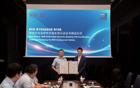 7月10日,国内商用车首张UN ECE R155&ECE R156车型VTA证书颁证仪式在比亚迪总部举行。