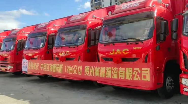 近日,在贵州林鑫物流有限公司内,12辆红色的江淮德沃斯中卡戴着大红花一字排开,车前铺着红地毯,备着锣鼓队,这里...