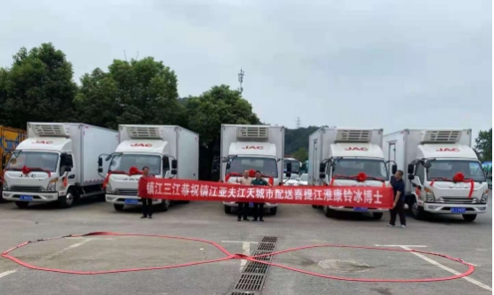 8月27日上午10点,5台江淮康铃冰博士冷藏车整齐划一排成一列,交付镇江亚夫江天城市配送有限公司。镇江亚夫江天...