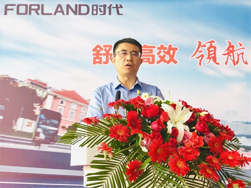 2019年7月8日,在山东莱州湾畔的古城昌邑,42台福田时代M3排列整齐,身披红花,等待交付。