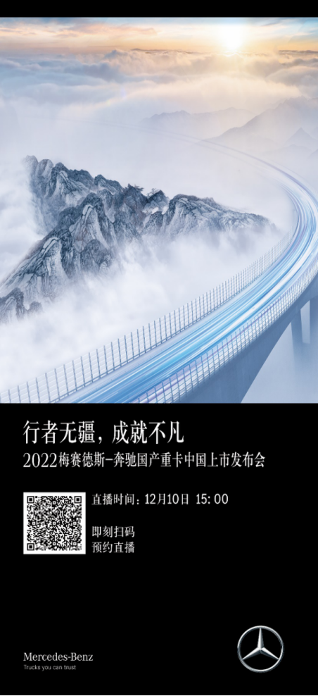 【2022年12月1日讯】匠心铸就不凡,畅享驰骋无疆。12月10日15点,2022梅赛德斯-奔驰国产重卡中国上市发布会即将揭幕。此次活动以“行者无疆,成就不凡”为主题,将通过别具匠心的多元形式解读梅赛德斯-奔驰国产重卡产品及服务亮点,深度诠释“In China For China 星耀东方 行稳驰远”的价值主张。届时,观众们可通过关注“梅赛德斯奔驰卡车”官方视频号收看发布会盛况,共同见证梅赛德斯-奔驰卡车国产化项目驶入全新征程。