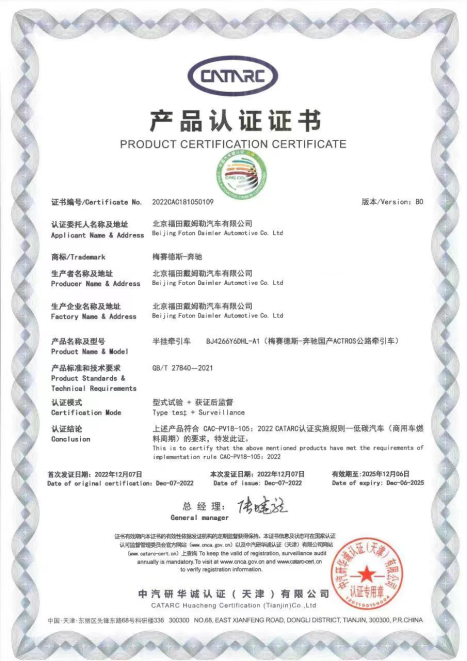 梅赛德斯-奔驰国产重卡Actros 6×4公路牵引车获“低碳汽车(商用车燃料周期)”认证证书