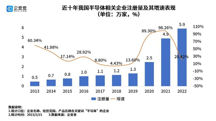 企查查数据显示,目前国内半导体相关现存企业共19.43万家,近十年,半导体行业在我国政策扶持下,市场扩张明显,尤其是2021年十四五规划提出,政策利好带动全年半导体相关企业注册量同比增加54.9%至14.4万家。