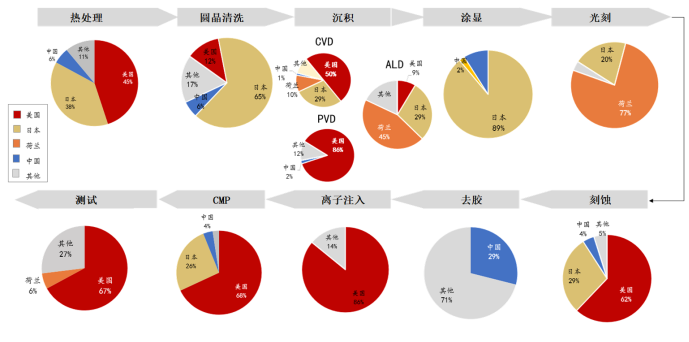 美国在薄膜沉积、离子注入、量测领域占据垄断地位。应用材料在PVD、CMP、离子注入全球市占率分别为86%、68%、64%,泛林在刻蚀、电镀设备占率分别为46%、78%,科磊在量测领域市占率54%。