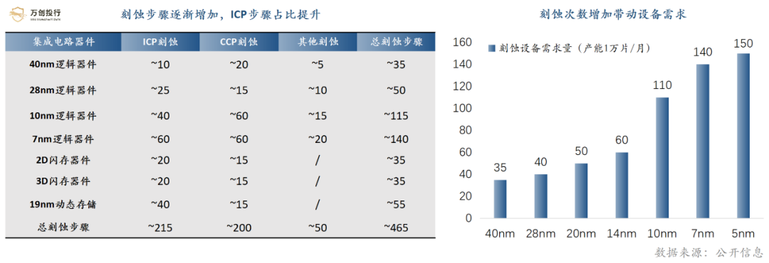 随着3D化集成电路采用缩小单层上线宽和增加堆叠层数的方法来增加集成度,因此不仅堆叠的层数增加,还需要刻蚀加工更深的孔以及更深的挖槽,对刻蚀各项指标的要求更加严苛,刻蚀技术也在不断地演进。制程升级使得精度要求越高,需要的刻蚀复杂度、步骤数量也在提升,所以刻蚀设备成为更关键的设备,市场需求不断扩大。