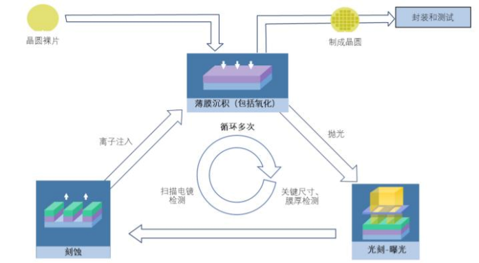 由于制程提升,晶圆上集成的器件和电路复杂度、密度随之提升,先进逻辑芯片和存储芯片需要上千道工序去完成芯片的制造。
