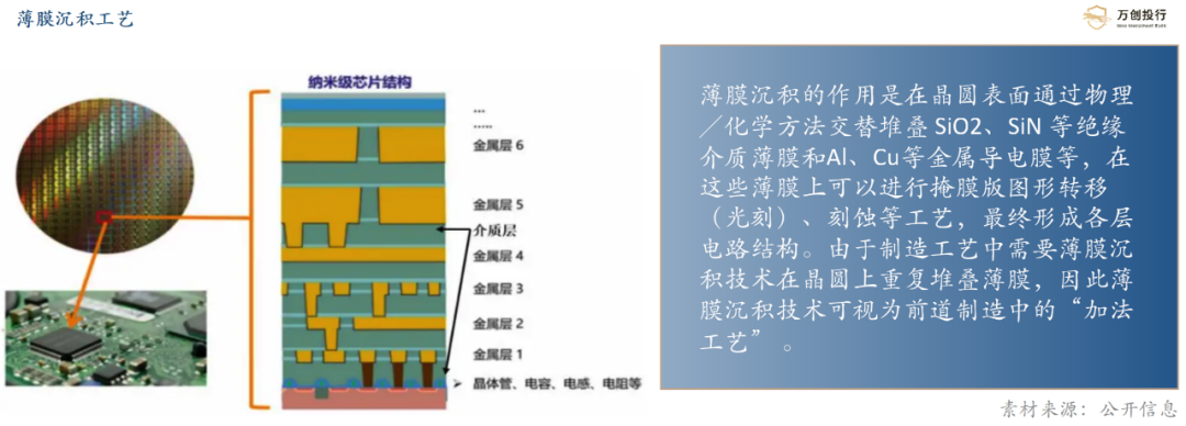 薄膜沉积工艺: 芯片是由一系列有源和无源电路元件堆叠而成的3D结构,薄膜沉积是芯片前道制造的核心工艺之一,主要是指在硅片衬底上沉积一层待处理的薄膜材料,如二氧化硅、氮化硅、多晶硅等非金属以及铜等金属。