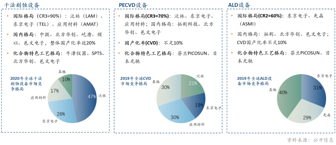 目前,刻蚀以及薄膜沉积设备国产化率较低,海外设备厂商占领全球大部分市场份额。受国际贸易影响,即海外(美、日、欧)国家对我国提出半导体芯片和设备的出口管制,进一步加快我国半导体产业迈向独立、自主,实现更高的国产化率。因此,催生了半导体设备行业中众多投资机会。