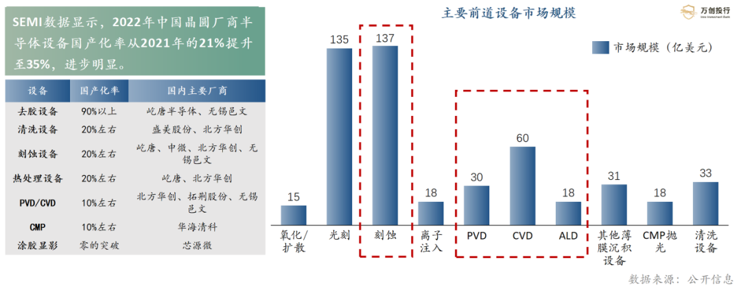 半导体前道核心设备因在产业链中处于不可撼动的重要地位且投资成本占比大,整体市场规模约500亿-600亿美金。其中刻蚀、光刻和薄膜沉积设备分别占比约20%-25%,在前道工序中价值量占比最高。