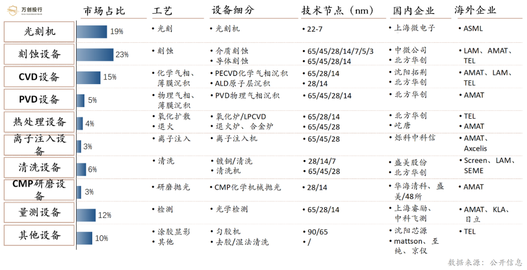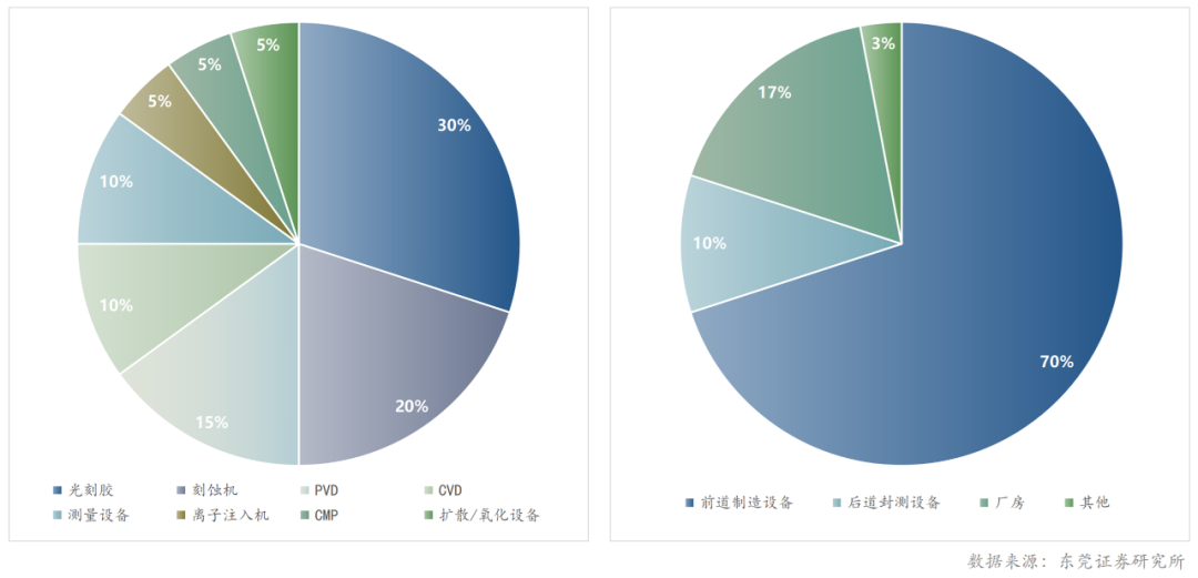 半导体设备是晶圆线扩产的主要支出来源,分为前道晶圆制造设备和后道封装设备,其中前道设备包括光刻机、刻蚀机、CVD 设备、PVD设备、 离子注入设备和 CMP 研磨设备等,后道设备包括测试机、探针台和分选机等,而在前道制造设备中, 投资占比前三分别为光刻机、刻蚀机和薄膜沉积设备。