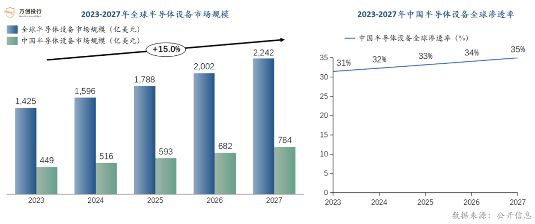 到2027年,全球半导体设备市场规模预计达到2242亿美元,2023—2027年年复合增长率达到12%。随着中国半导体产业链的不断完善,下游需求增长将进一步带动上游设备出货,预计2027年中国大陆半导体市场规模将达到783亿美元,2023—2027年年复合增长率达到15%。同时,中国半导体设备市场在全球的渗透率达到35%,市场空间广阔。