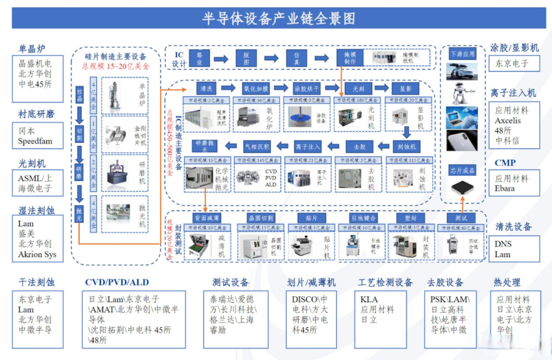 从行业竞争格局看,全球半导体设备的市场集中度极高,单一设备的主要参与厂商一般不超过5家,美、日、欧技术保持领先。