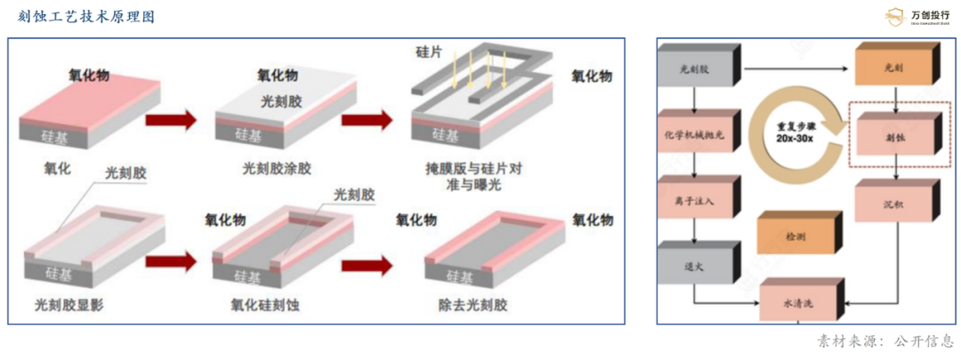 刻蚀工艺:刻蚀是半导体制造工艺及微纳米制造工艺中的一个重要环节,是利用化学或物理的方法有选择性地从硅片表面去除不需要材料的工艺过程。刻蚀步骤的目的是把图形从掩模板转移到待刻蚀的硅、金属或介质薄膜上。