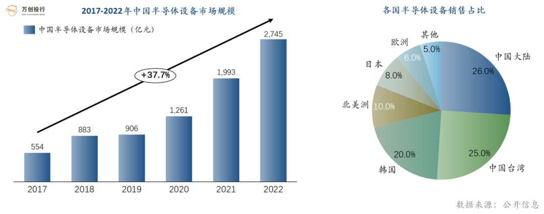 其中,中国半导体设备的市场规模增速明显,2022年中国半导体设备市场规模达到2745.15亿元,同比增长38%,预计2023年中国大陆半导体市场规模将达3032亿元。中国大陆半导体设备销售额占全球销售额26%,达到283亿美元,超出中国台湾(25%)、韩国(20%)、北美(10%),已经连续三年成为全球最大半导体设备市场。