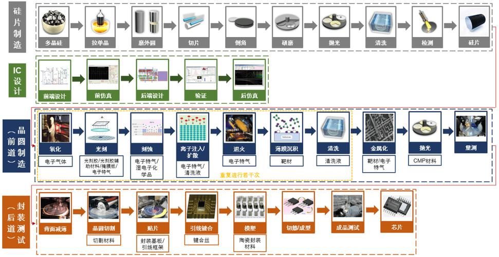 前道制造工艺是通过物理、化学工艺步骤在晶圆表面形成器件,并生成金属导线将器件相互连接形成集成电路。前道工艺共有七大步骤,分别为氧化/扩散、光刻、刻蚀、离子注入、薄膜生长、清洗与抛光、金属化,通过循环重复上述工艺,最终在晶圆表面形成立体的多层结构,实现整个集成电路的制造。