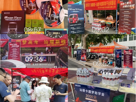 中国重汽汕德卡同样在高考期间为考生和家长送上关怀,在全国各地组建经销商服务队伍,深入考点一线,设立高考助考点,免费为考生及家长提供饮用水、药品等物资,为莘莘学子打造考场外的“温馨港湾”。